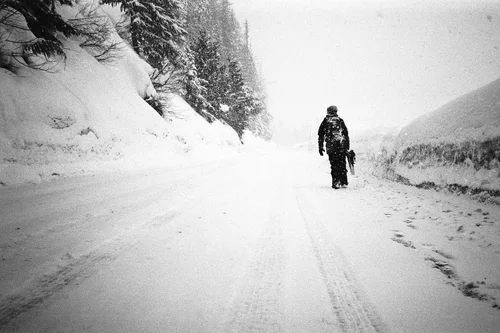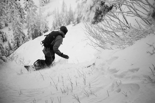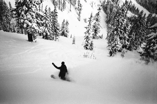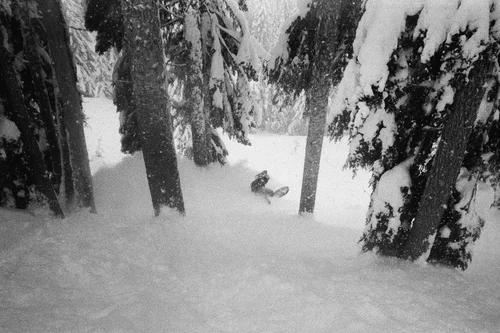 I was determined to create images that looked like what it feels like to ride with your friends on a stormy, low vis day at Baker. I wanted grainy, blurry, black and white images of the locals riding from open to close because they love to. Because they worked all summer so they don’t have to all winter. I wanted something I could share with anyone, anywhere that could convey the joy of snowboarding with people you love.